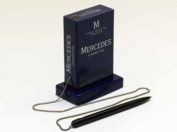 Kugelschreiberhalter in Produktform mit hochwertiger Beschriftung.