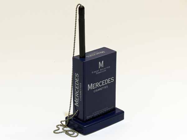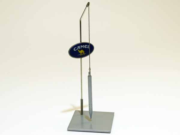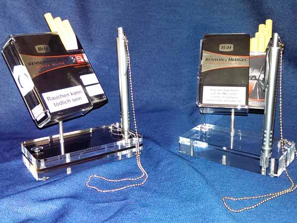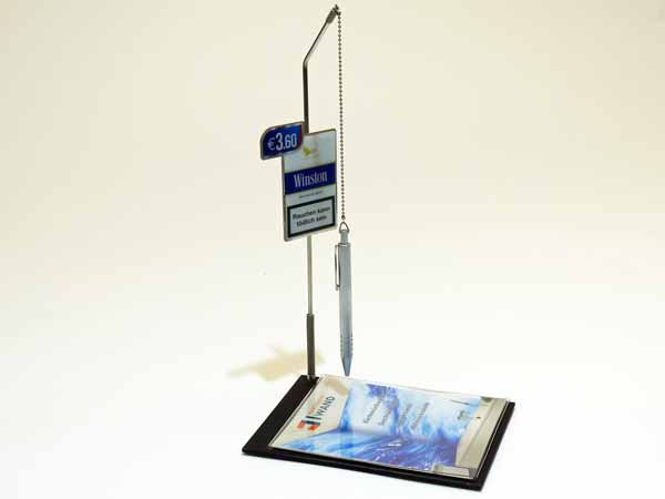Kugelschreiberhalter mit Werbung und Produktinfo.