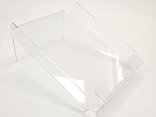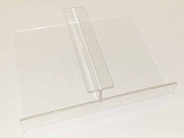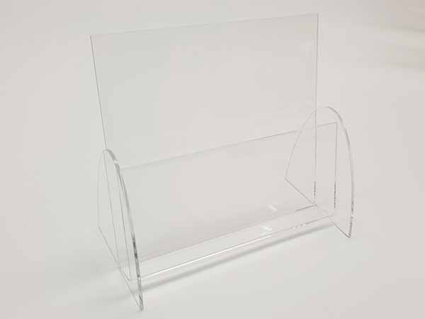 aus 2mm klarem Acrylglas gelasert und geknickt für 1 Prospekt DIN A4, freistehend.